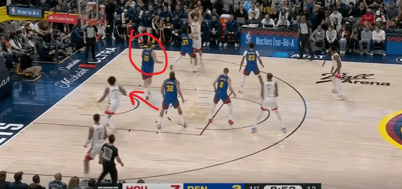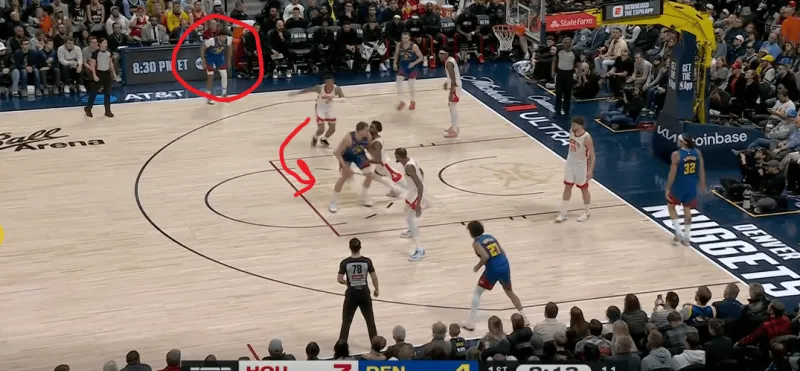 火箭进攻被逼至底线附近,约基奇及时提上封锁了小史密斯的接球线路: