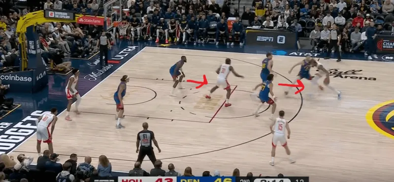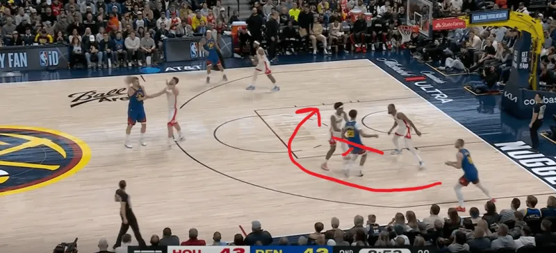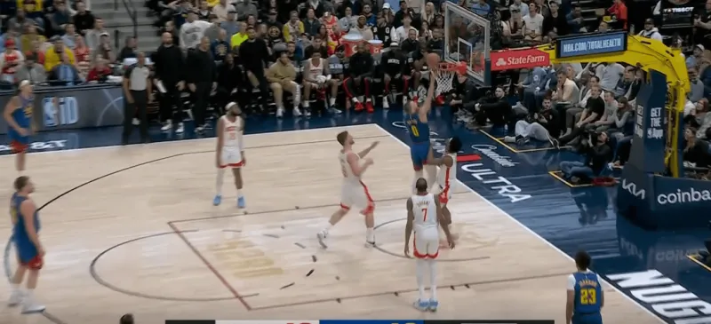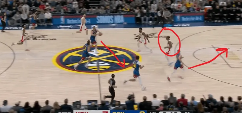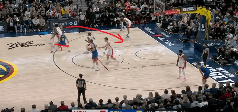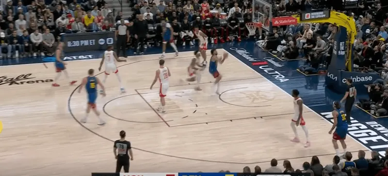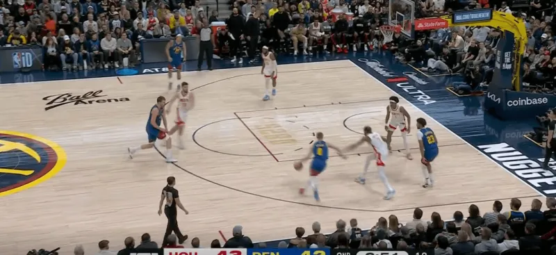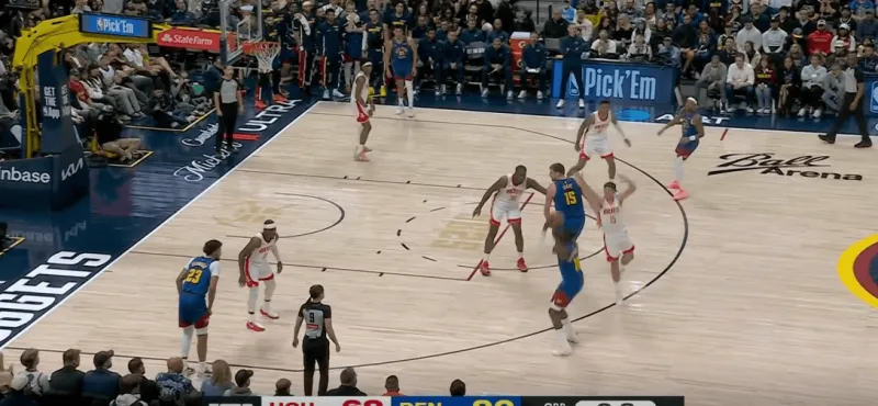 转换进攻掘金四打二,约基奇身后跟进,利用火箭两名退防人优先回收禁区,直接找到左侧外弹重新定位的约翰逊命中底角三分:
