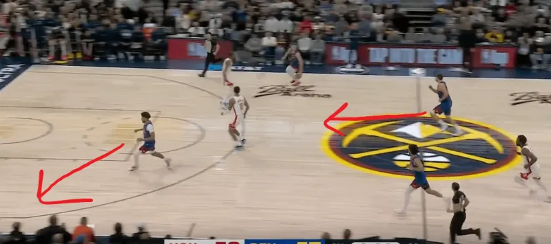 在转换进攻中,布劳恩的快下依然是掘金的武器,这一次退防中,杜兰特卡在约基奇直接出球布劳恩的线路上,但右侧掘金已形成人数优势,约基奇选择出球给约翰逊,后者再利用杜兰特的提上助攻切入的布劳恩,十分清晰的团队进攻思路: