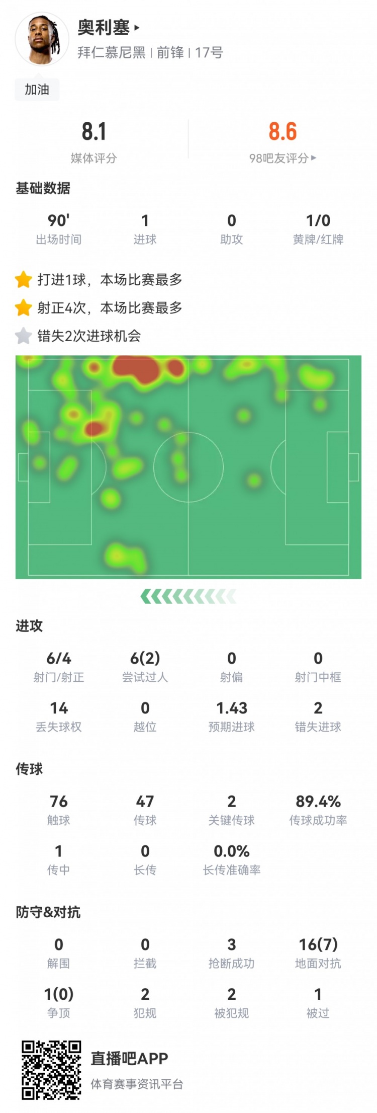 8月31日德甲第2轮,拜仁慕尼黑客场3-2力克奥格斯堡。本场比赛奥利塞首发出战并打满全场,他的全场关键数据统计如下: