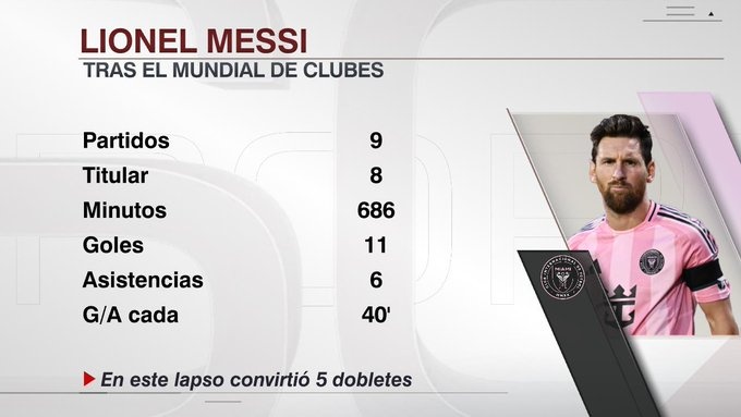 据ESPN数据统计,自世俱杯以来,梅西出战9场比赛,其中8次首发,累计登场686分钟,贡献11粒进球和6次助攻,平均每40分钟即可参与一粒进球。